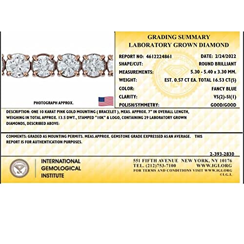 10K ROSE GOLD ROUND LAB GROWN DIAMOND VS 16.53 CERTIFIED LAB GROWN DIAMOND TENNIS BRACELET 7" ROSE GOLD: This classic women's tennis bracelet features round brilliant cut lab grown diamonds. All diamonds are prong set in solid 10k pink rose gold with a double lock. IGI certificate is included. 10k