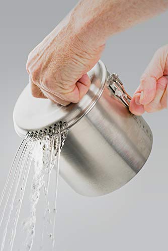 INCLUDES: Durable 1. 8-liter stainless steel pot, lid, two 20oz wide-mouth mugs with insulated sleeves and Sip-It lids, two 20oz bowls, a couple of Foons – that’s our folding spork – and a carry bag that doubles as a sink.