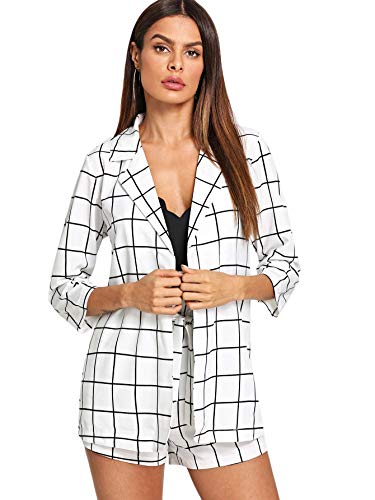 SheIn Women's 2 Pieces Outfits Plaid 3/4 Sleeve Blazers and Tie Waist Shorts Set