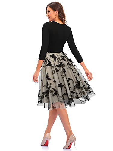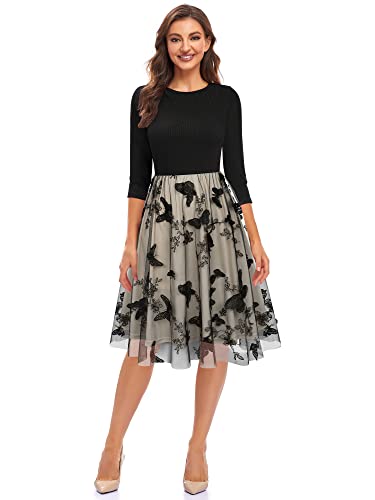 Niysciot Women's Casual 3/4 Sleeve Dress Vintage Floral Flared A-Line Swing Crew Neck Waist Knit Splice Mesh Party Dresses