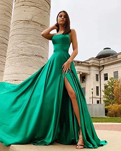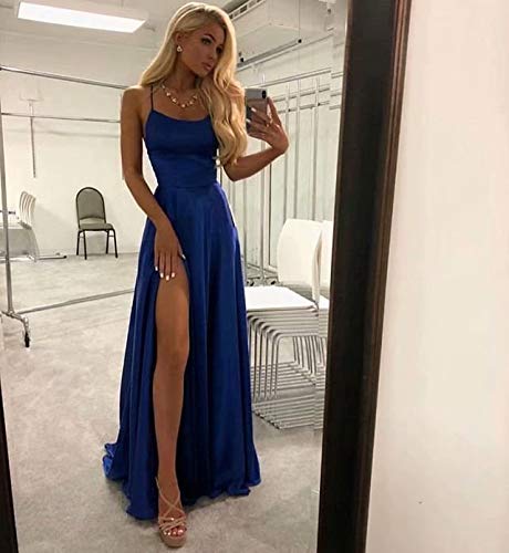 Women's Halter Prom Dresses Long Side Spilt Backless Satin Formal Evening Gowns with Pockets