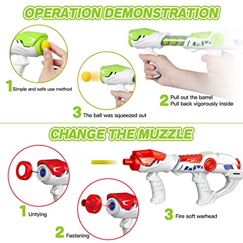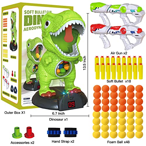 【2022 DINOSAUR SHOOTING GAME KIT】 Dinosaur Gun target toys equipped with 1 dinosaur shooting target, 2 Air Pump Gun, 2 Tactical Wristband, 18 Soft Bullets, 48 Foam Balls(orange & yellow). Electric Scoring Target is a perfect addition to kids' growing armory.This dinosaur toy not only can be used as a personal shooting training gifts but also can be used as a perfect dinosaur shooting games between kids or family interactions.