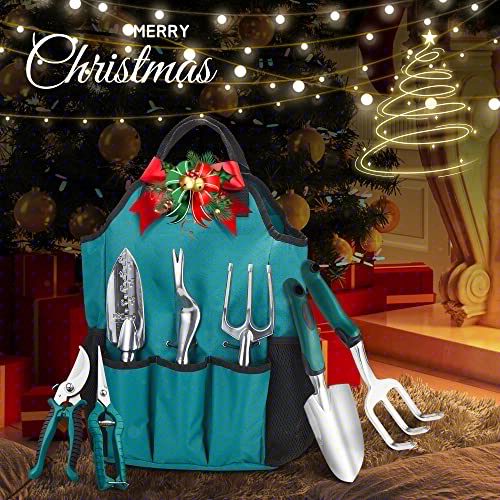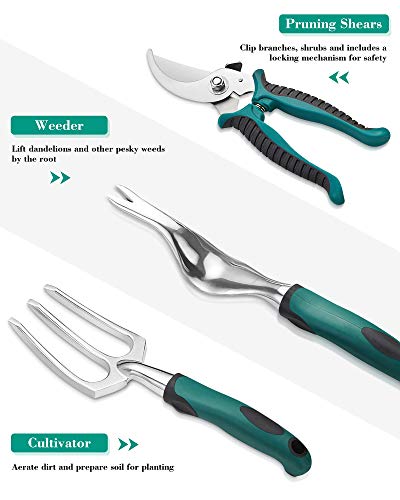 11-PIECE GARDENING SET: This essential all-in-one gardening set includes a large trowel, small trowel, hand rake, cultivator, weeder, pruning shears, 100ft gardening rope, handheld sprayer, digging claw gardening gloves, pruning snips, and an Oxford cloth tote to keep all your tools packed away and organized so you can prune, dig, weed, aerate, and plant to perfection.