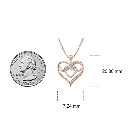 1/10cttw DIAMOND DOUBLE HEART AND INFINITY NECKLACE IN ROSE GOLD: 32 Real Round White Diamonds highlight the curves of the two Hearts and Infinity Sign of this Women's Pendant. Pave-set Genuine Diamonds add sparkle to the Rose Gold Infinity and Hearts. The small Heart intertwines with the Infinity Sign, which is embedded in the larger Heart, representing two hearts joined forever. Included is an 18" Rope Chain Necklace of 10k Rose Gold with a spring ring closure. Total Diamond weight is 1/10ct